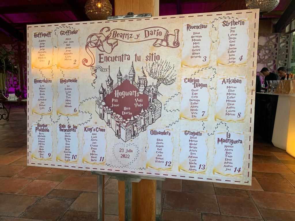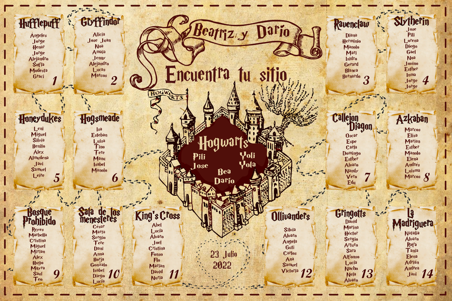 Bea se puso en contacto conmigo porque querían que su boda fuera mágica y única. Me pidió el diseño del seating plan basado en el Mapa de Merodeador de Harry Potter.