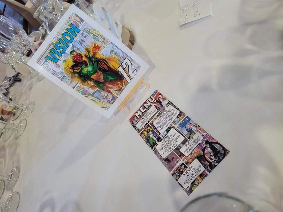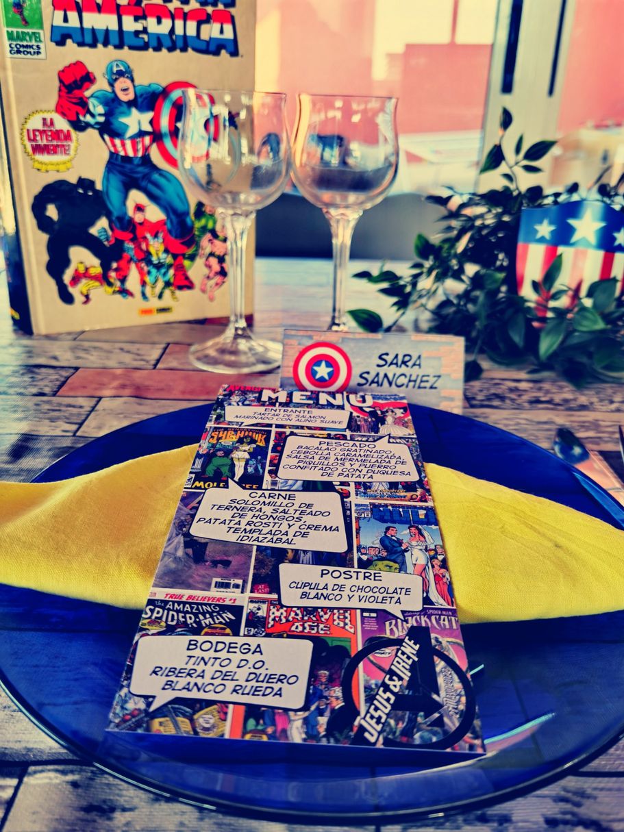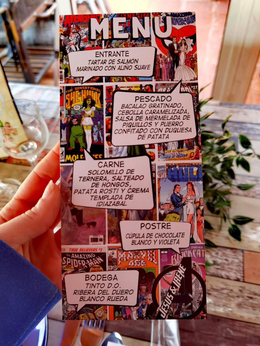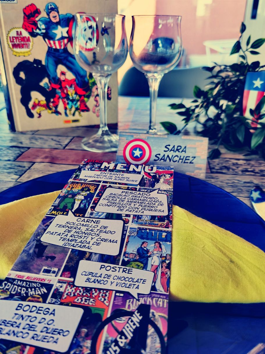Jesús e Irene se pusieron en contacto conmigo porque se enamoraron del diseño de Marvel y lo querían para su gran día. Les hice el diseño de las minutas, el cartel de bienvenida y los meseros.