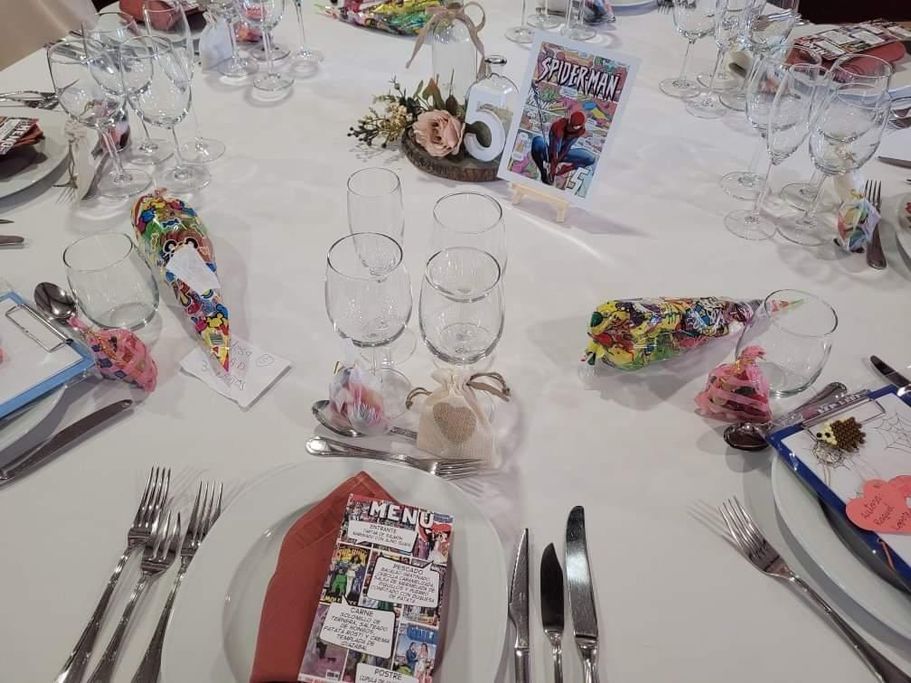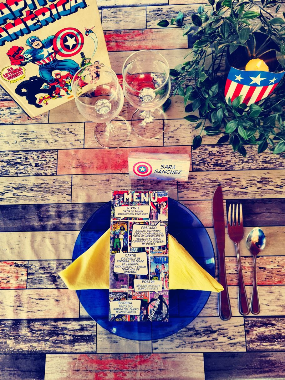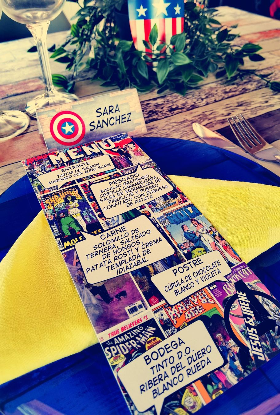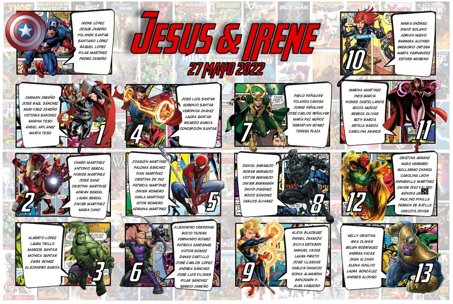 Jesús e Irene se pusieron en contacto conmigo porque se enamoraron del diseño de Marvel y lo querían para su gran día. Les hice el diseño de las minutas, el cartel de bienvenida y los meseros.