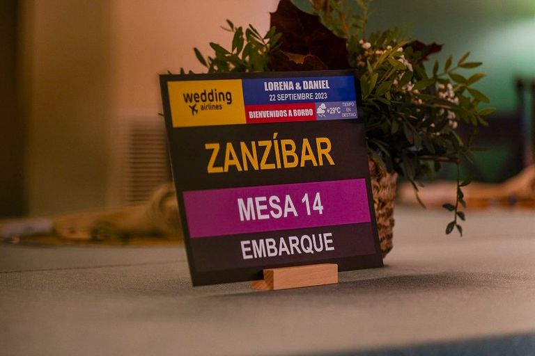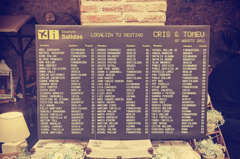 Les encanta viajar y no me sorprendió cuando me dijeron que querían el plan de asientos como si fuera un panel de aeropuerto y los marcasitios querían que parecieran unas tarjetas de embarque.