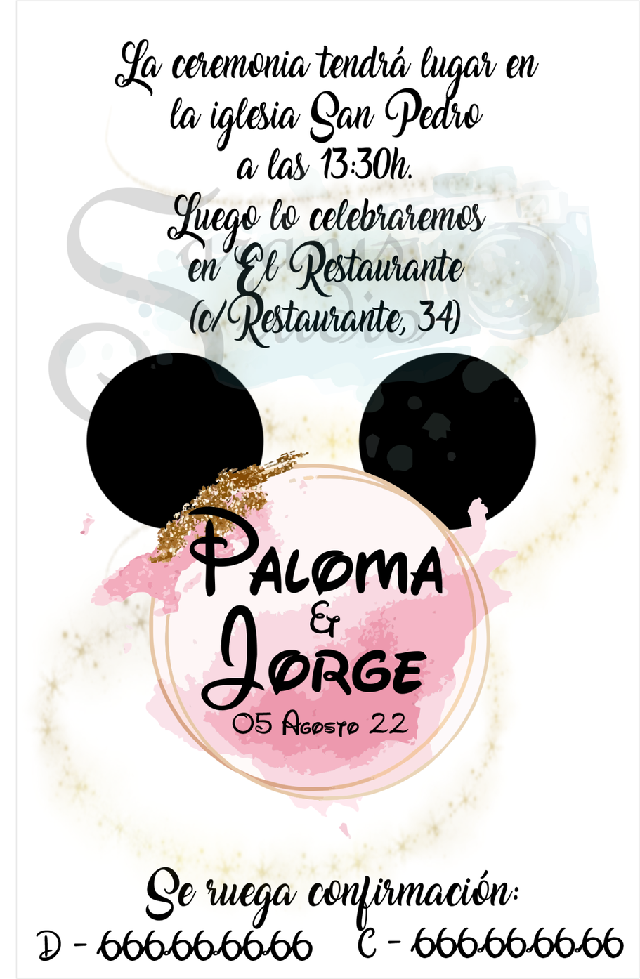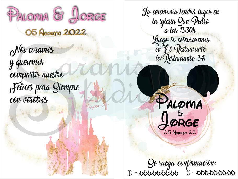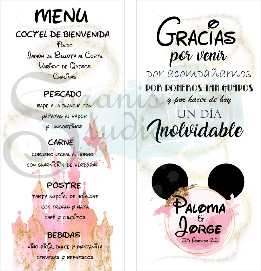 Perfecto para cualquier fan de Disney en el día de su boda. Este conjunto de papelería boda seguramente llamará la atención de todos sus invitados en su gran día. ¡Un diseño verdaderamente único, divertido y elegante hecho para vuestro día especial.