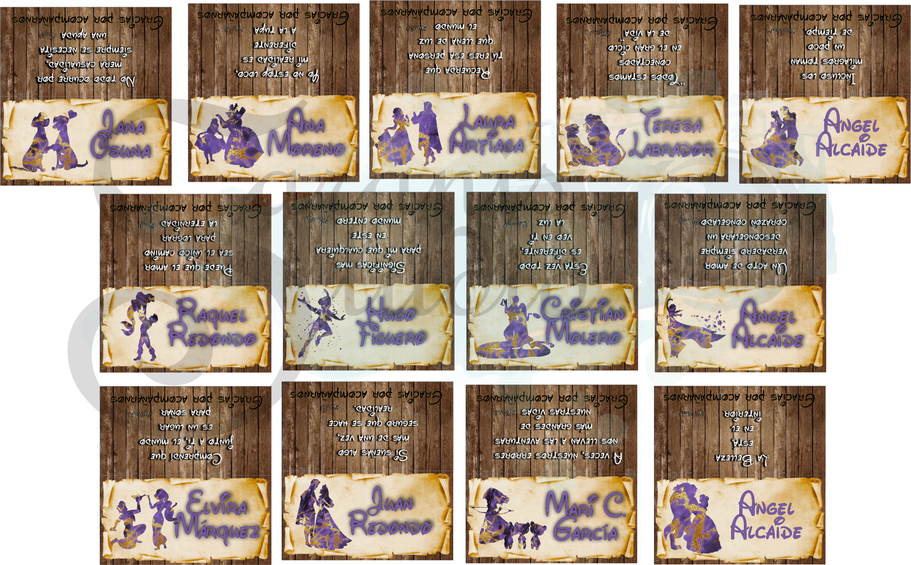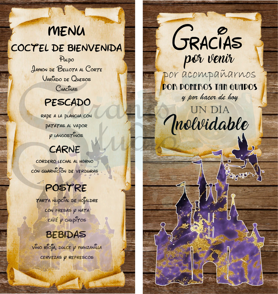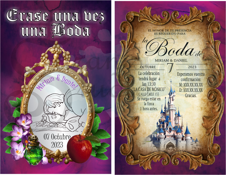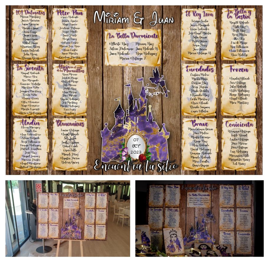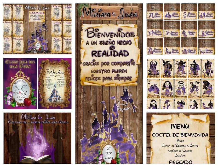 ¡Tu boda al estilo de Disney pero con tu toque personal más oscuro con los Villanos de las películas! Con diseño personalizado del "seating", Invitaciones, Nombres de mesa, Minutas del Menú, Carteles de Bienvenida, Sello de Boda y Nombres de invitados.