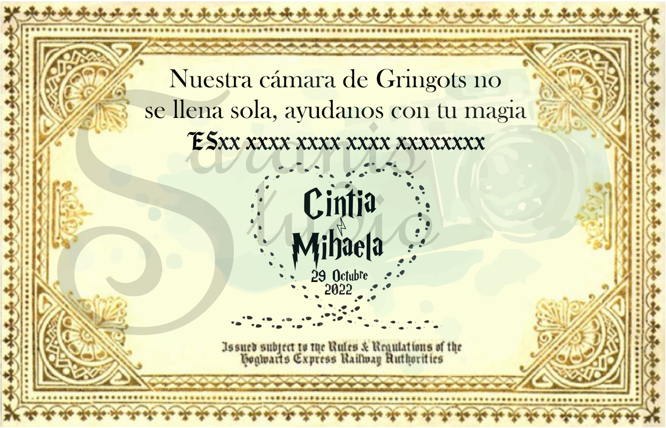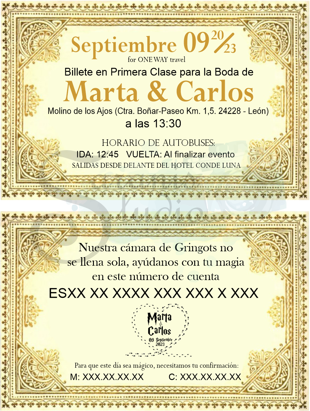 Por un lado un Billete de tren para el Hogwarts Express de gran tamaño y por el otro lado una carta de admisión