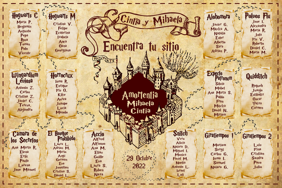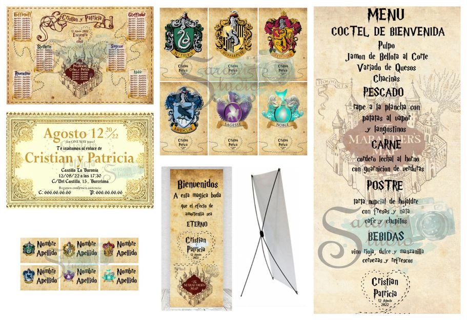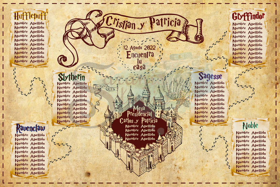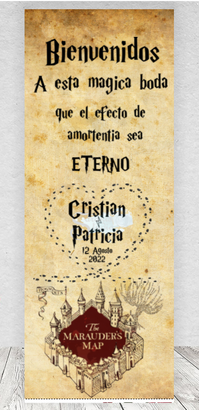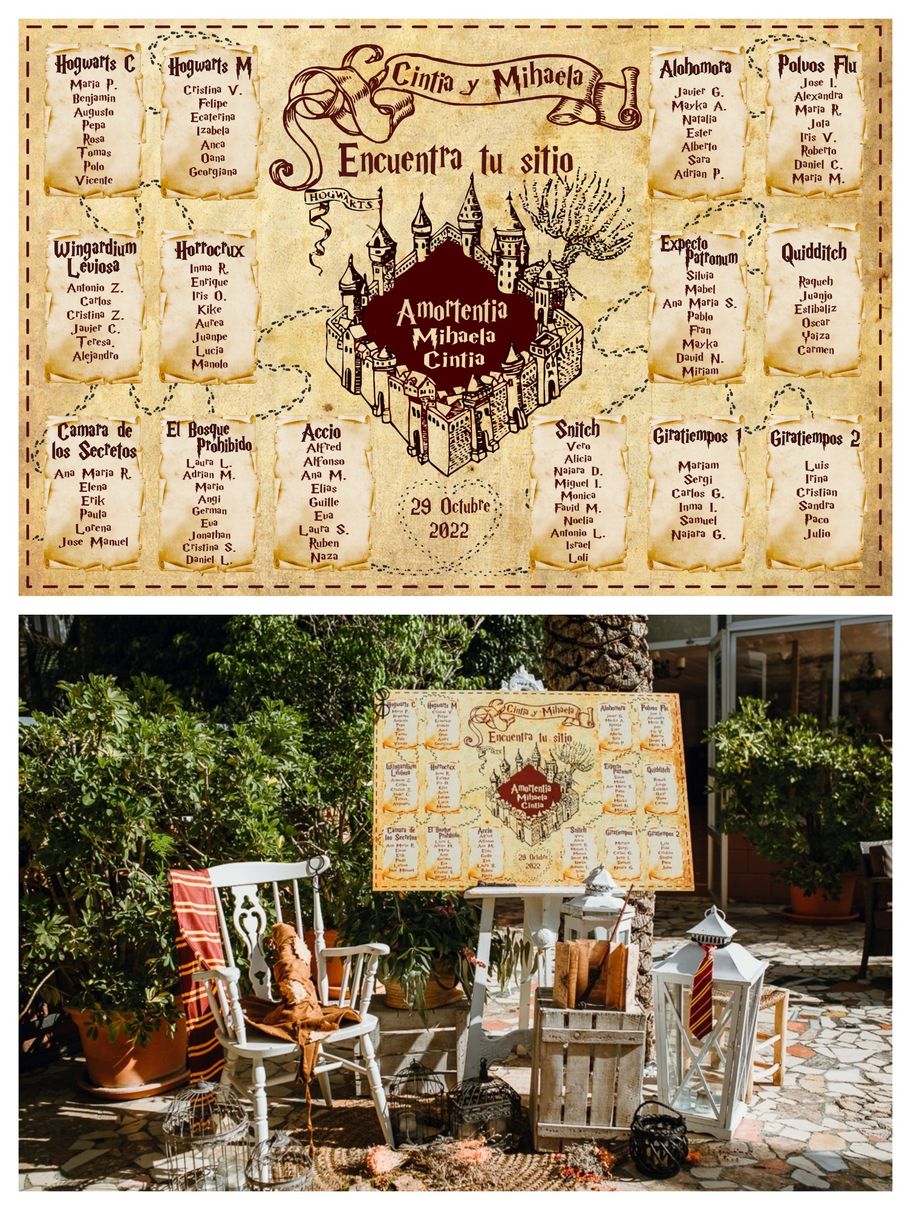 ¡Tu boda al estilo de Harry Potter! Con un diseño de Seating Basado en el Mapa de los merodeadores y las casas del mundo mágico junto con una invitación con la que tus invitados podrán emprender un mágico viaje al estilo de Hogwarts Express.