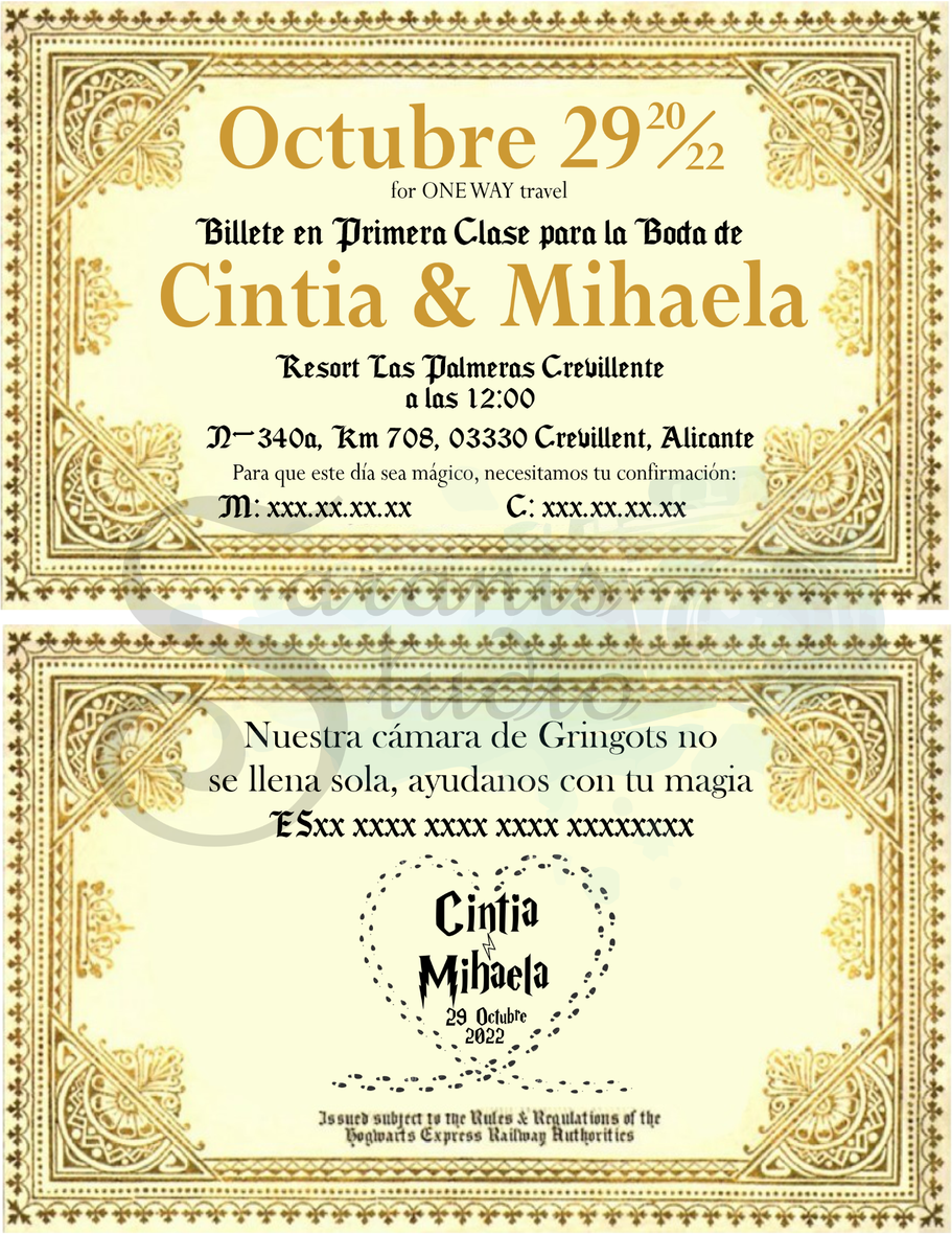 Perfecto para cualquier fan de Harry Potter en el día de su boda. Este conjunto de papelería boda seguramente llamará la atención de todos sus invitados en su gran día. ¡Un diseño verdaderamente único, divertido y elegante hecho para vuestro día especial! ¡Haz que tu boda sea mágica!