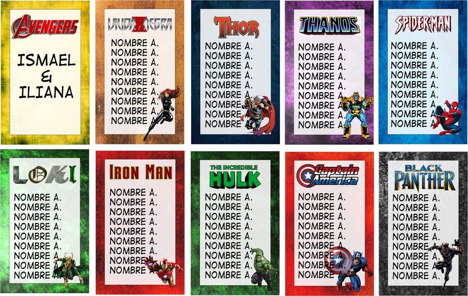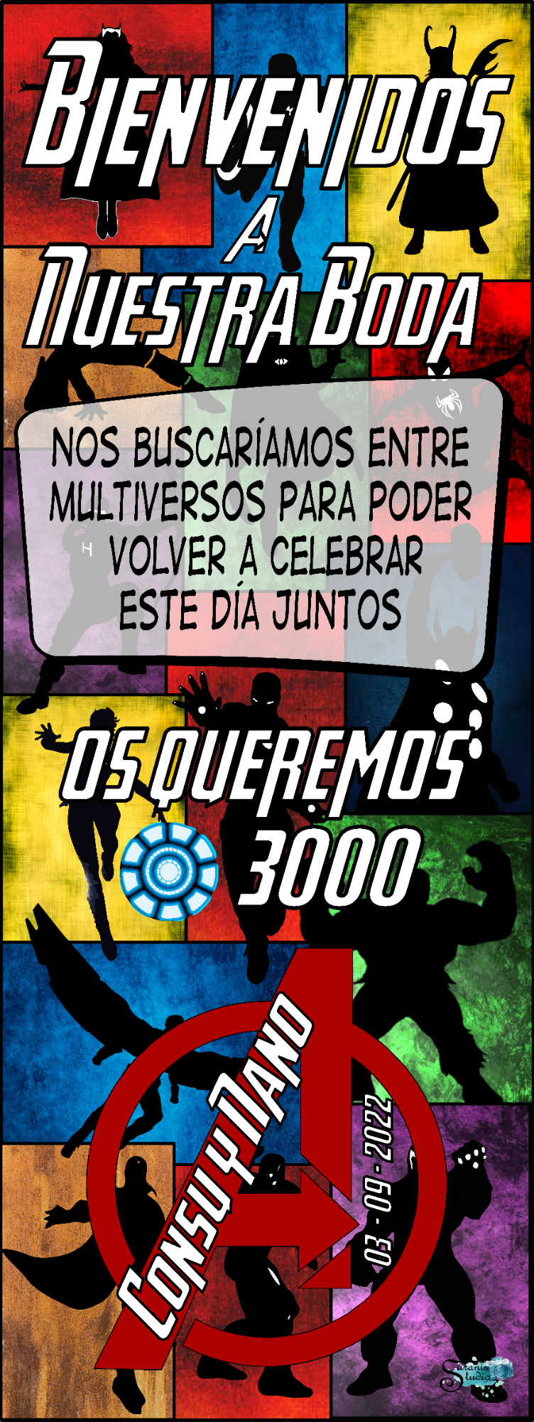 ¿Sois una pareja fan de los comics y de los Superhéroes de Marvel? Este diseño de boda está hecho especialmente para vosotros. Un diseño con Thor, Iron Man,Hulk, Capitan América, Viuda Negra, Hawkeye, Dr Strange y Spiderman,... pero podéis elegir los superhéroes o villanos que queráis y yo os lo hago a medida y a vuestro gusto.