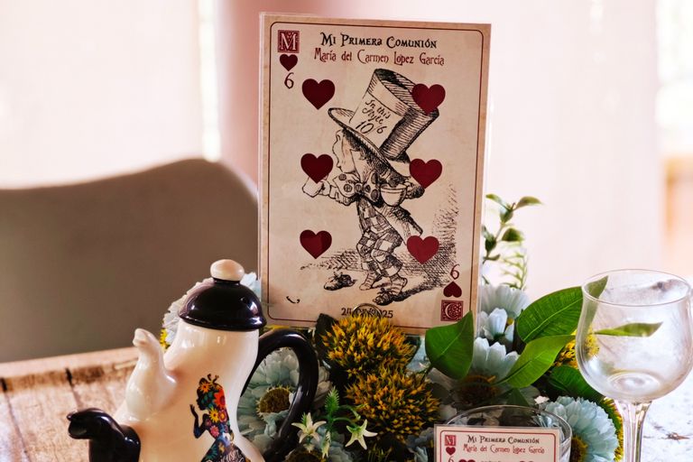 Los papis de Mª del Carmen se decidieron a última hora para la decoración temática basada en Alicia en el País de las Maravillas, así que sorprendieron a su hija con unos marcasitios que a su vez eran detalles para los invitados, los meseros y el seating.