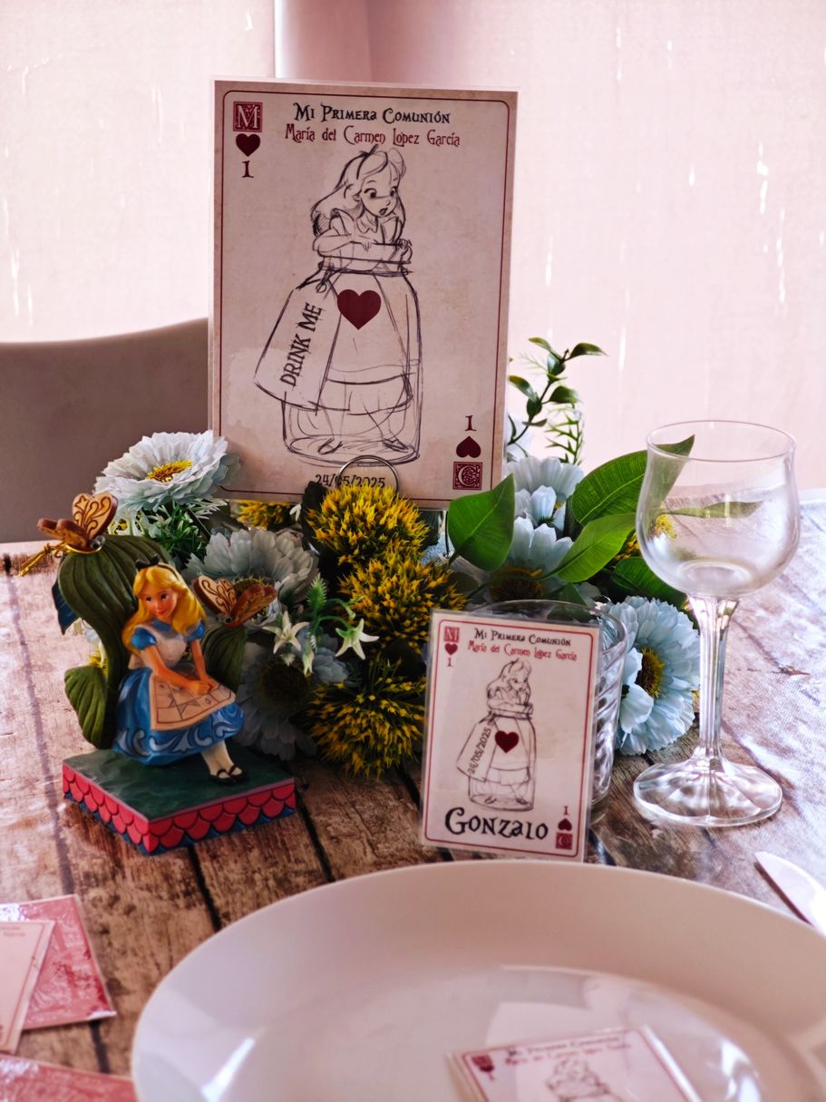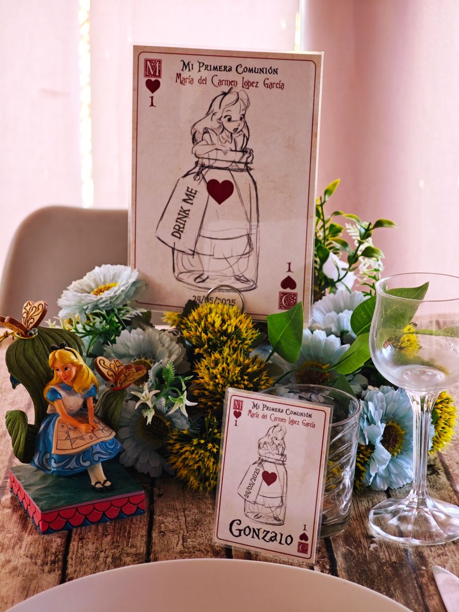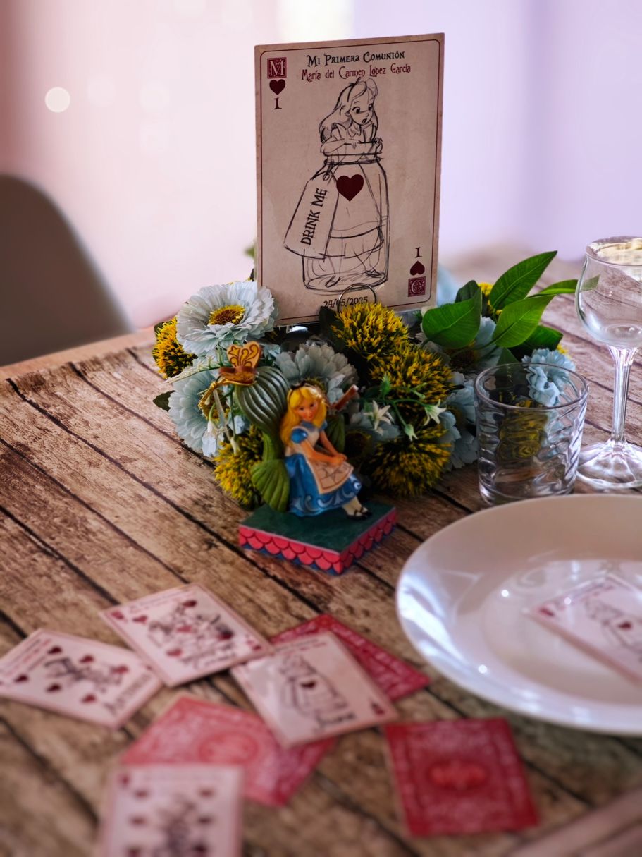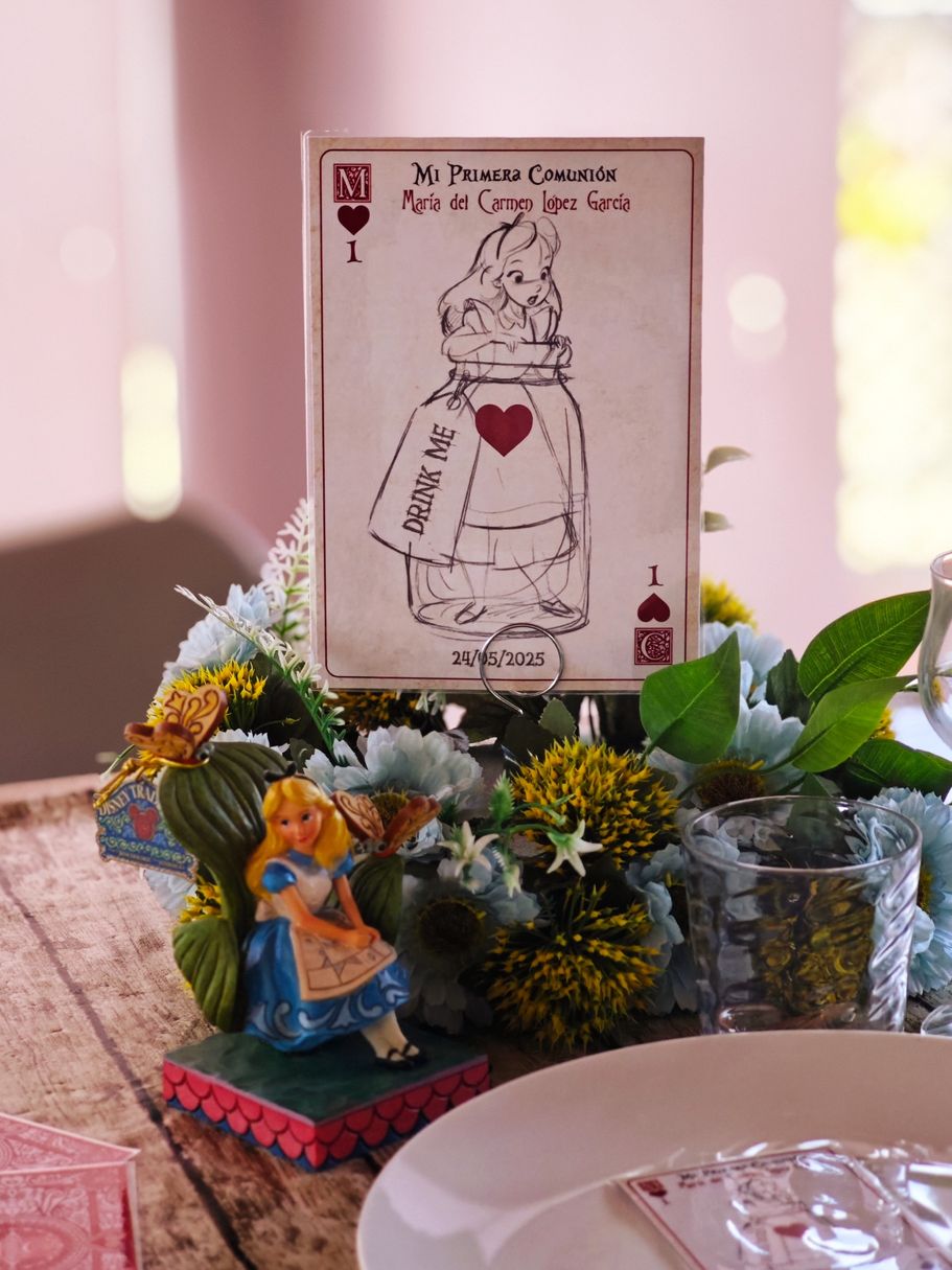 Los papis de Mª del Carmen se decidieron a última hora para la decoración temática basada en Alicia en el País de las Maravillas, así que sorprendieron a su hija con unos marcasitios que a su vez eran detalles para los invitados, los meseros y el seating.