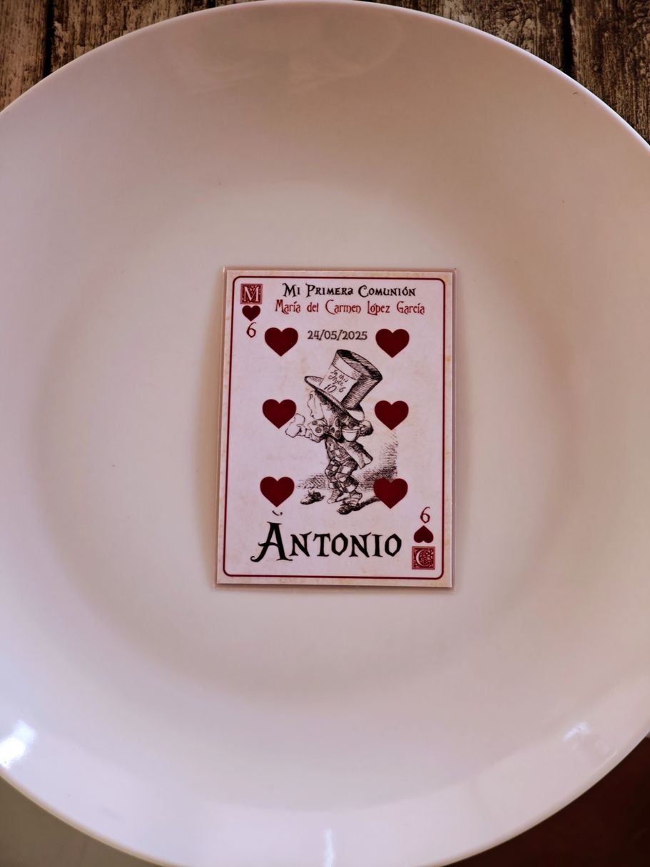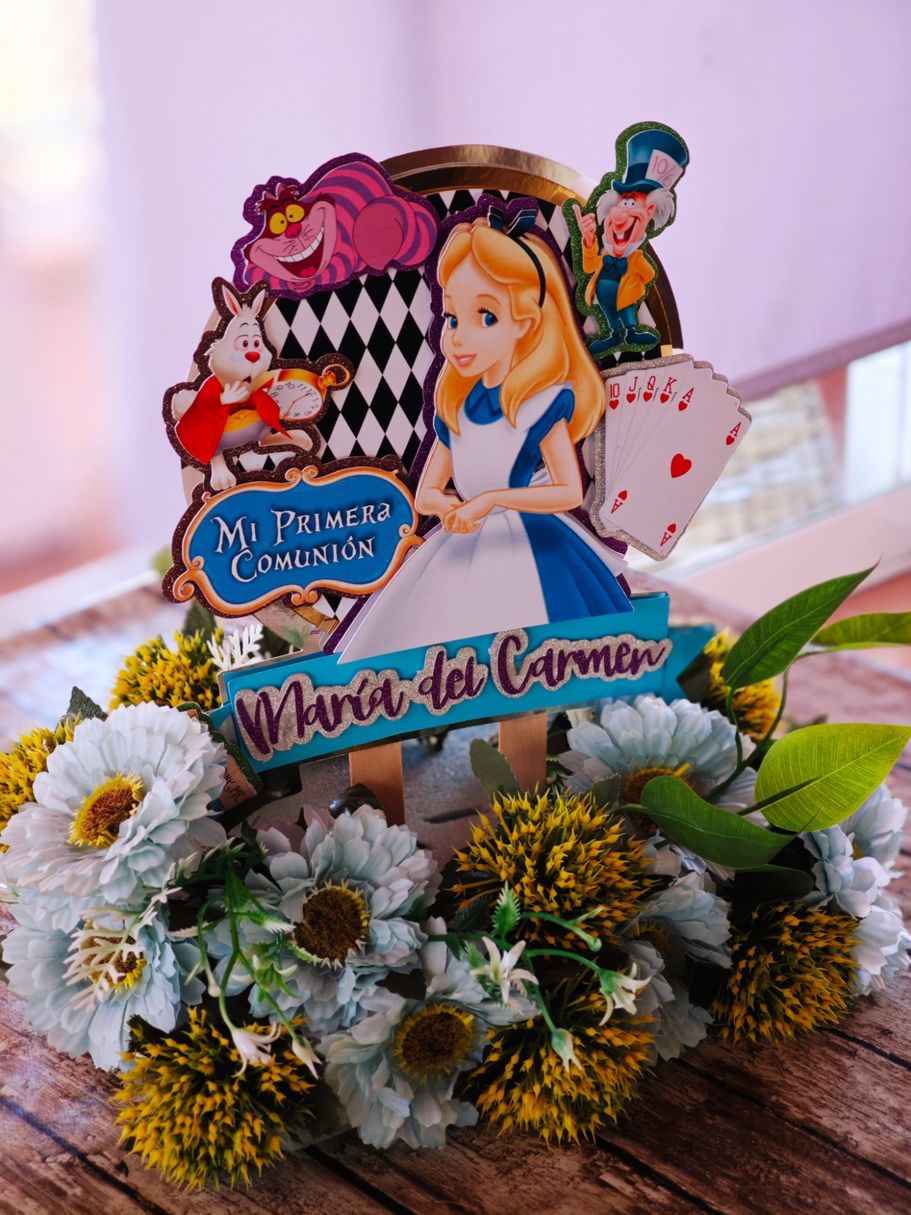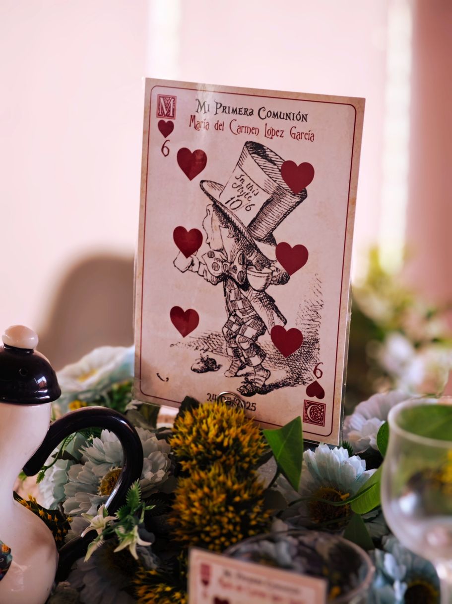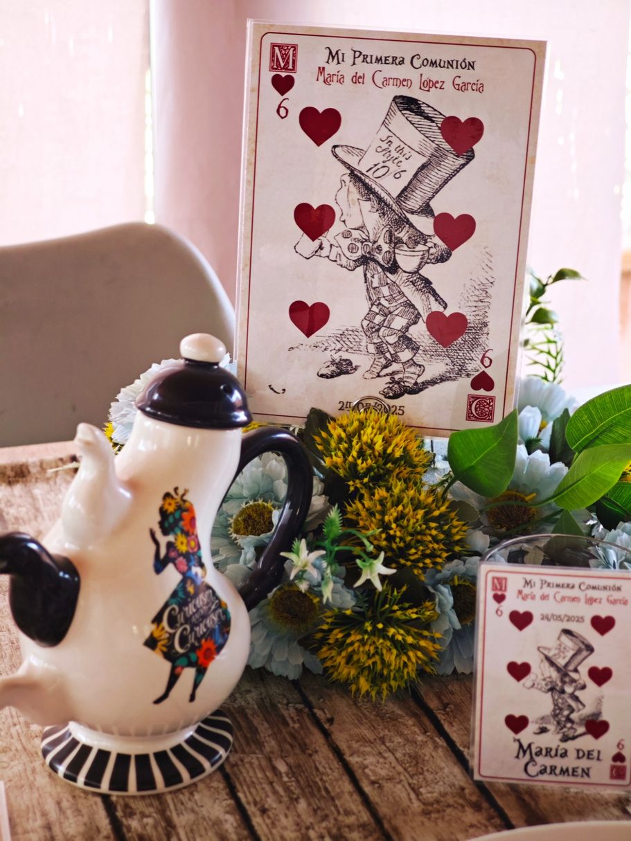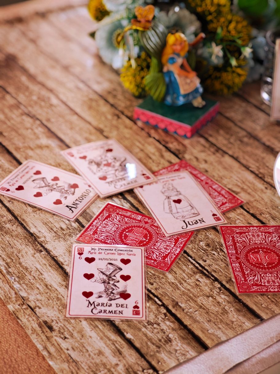 Los papis de Mª del Carmen se decidieron a última hora para la decoración temática basada en Alicia en el País de las Maravillas, así que sorprendieron a su hija con unos marcasitios que a su vez eran detalles para los invitados, los meseros y el seating.