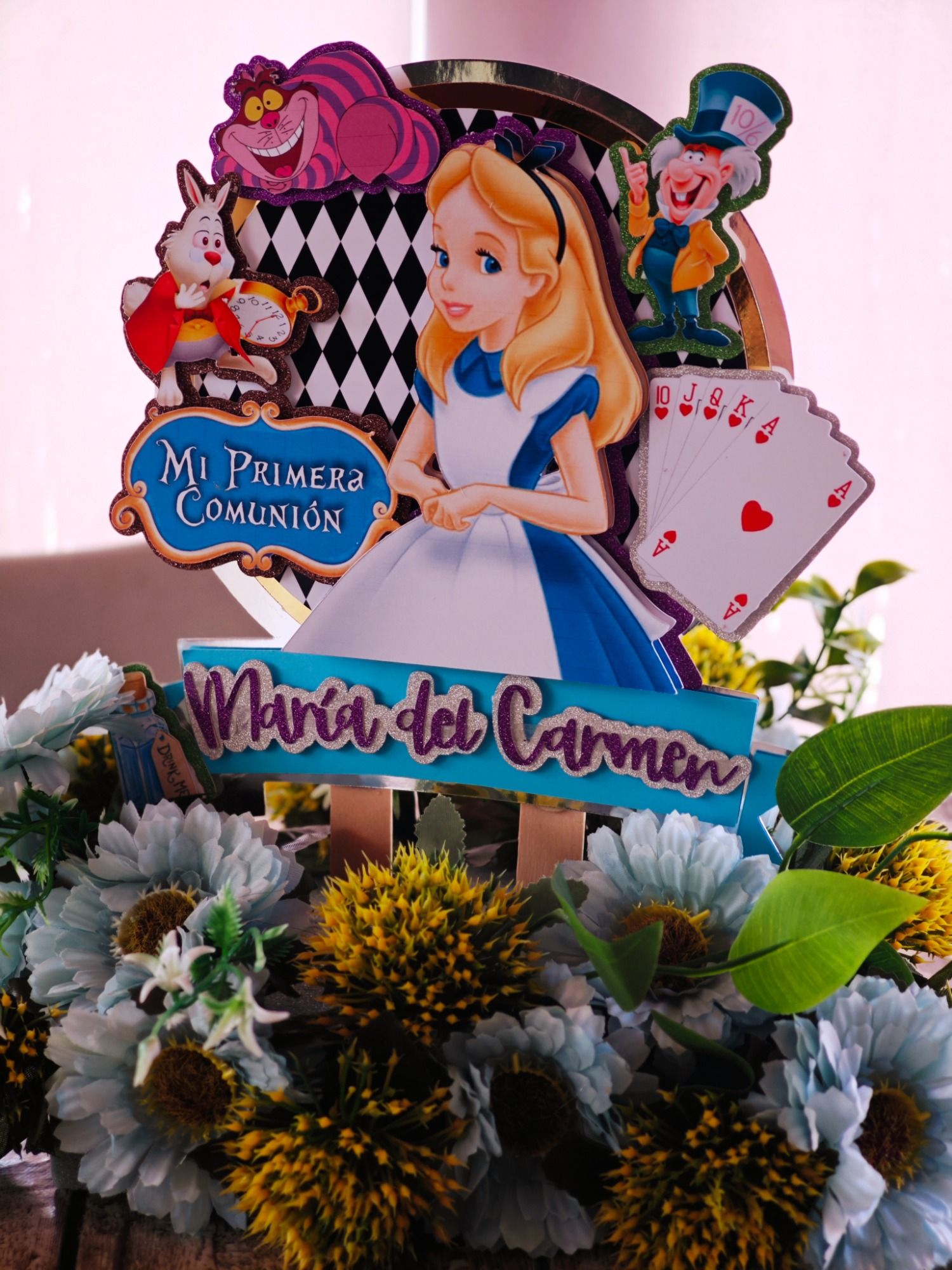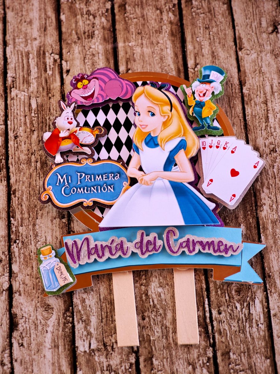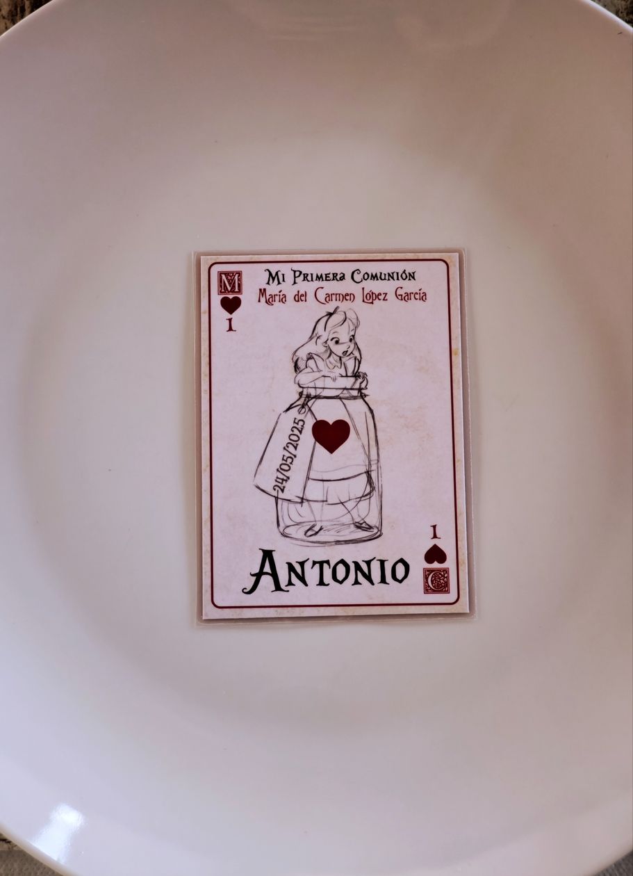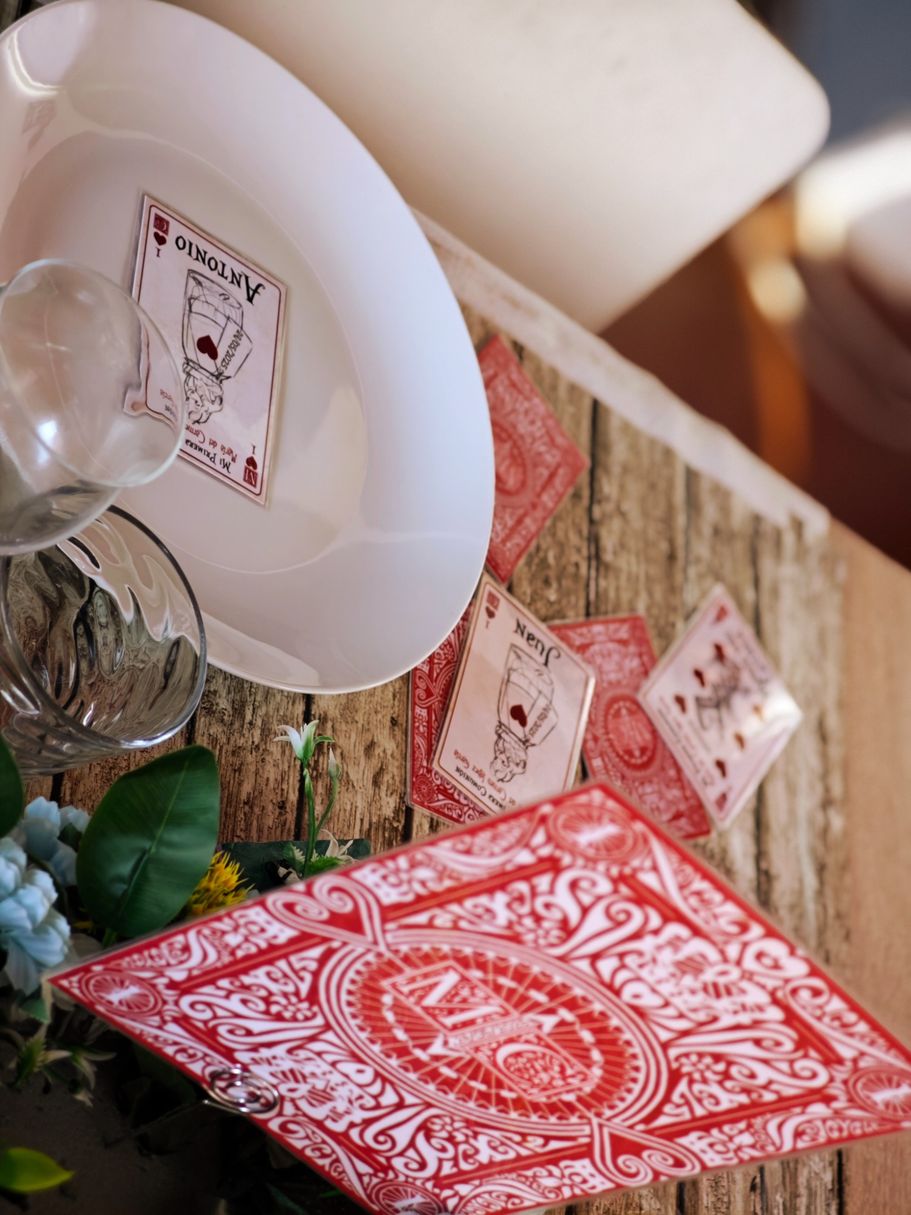 Los papis de Mª del Carmen se decidieron a última hora para la decoración temática basada en Alicia en el País de las Maravillas, así que sorprendieron a su hija con unos marcasitios que a su vez eran detalles para los invitados, los meseros y el seating.